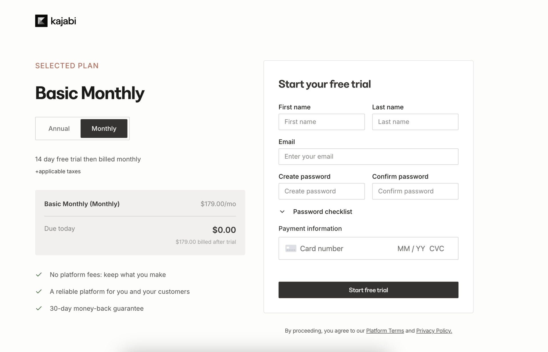 Kajabi’s answer: they put “Due today: $0.00” in huge type right next to the plan name and card field, plus a clear line “14-day free trial then billed monthly,” so it’s obvious nothing gets charged today.